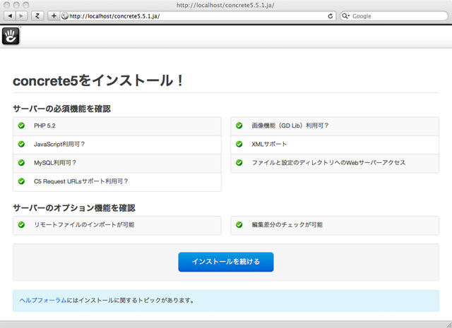 エラーが表示されなかったら作業完了ですので、concrete5を設置したディレクトリーにブラウザーからアクセスしてみましょう。すると、インストールプロセスが自動的にスタートします。