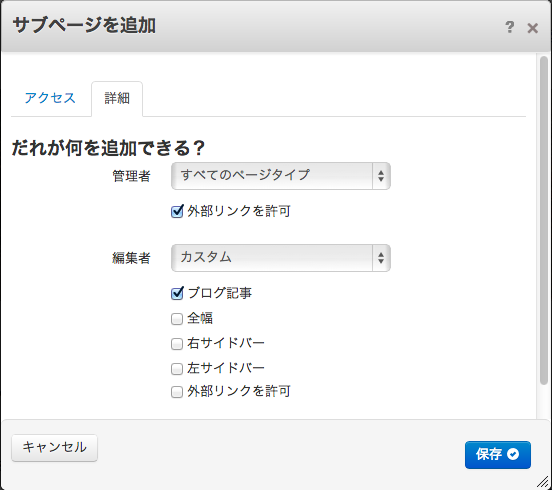 たとえば、この画面は「サブページを追加」権限の詳細タブですが、管理者は全てのページタイプの追加が可能ですが、編集者はブログ記事しか追加できないという設定になっています。