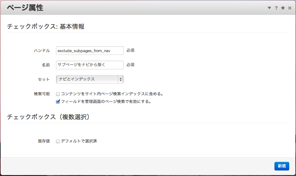 [管理画面 > ページとテーマ > 属性] ページにて、「属性を追加」プルダウンで属性タイプを選択して、「新規」ボタンをクリックします。「サブページをナビから除く」または「ナビ上で最初の子ページにリンクする」の場合は「チェックボックス」を、「ナビゲーションクラス」の場合は「テキスト」を選択します。
