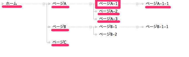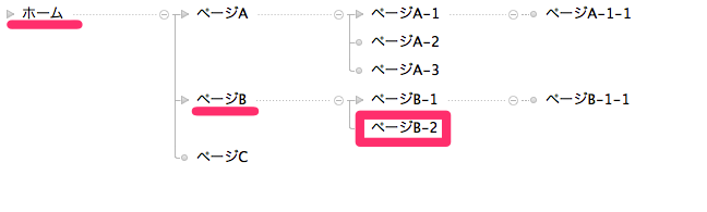 次に、第2階層を表示している場合、図では「ページA-1」を表示していますが、親ページは「ページA」になります。したがって、「ページA」の直接の子ページと、表示している「ページA-1」の子ページである「ページA-1-1」が表示されます。少しややこしいですね。
