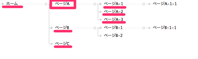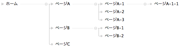 サイトマップ上の階層を指定して表示するページの条件を設定します。concrete5では「ホーム」は「トップ」階層(第1階層)として扱われますが、「ホーム」ページ直下のページも同じトップ階層扱いとなります。これがちょっと混乱しますが、こういうものだと覚えてください。その下が第2階層となります。以下の図では、ホーム、ページA、B、Cがトップ、ページA-1、A-2、A-3、B-1、B-2が第2階層、ページA-1-1が第3階層となります。