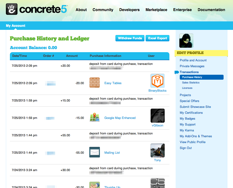 マーケットプレイスからの購入履歴は transactions ページから確認することができます。
