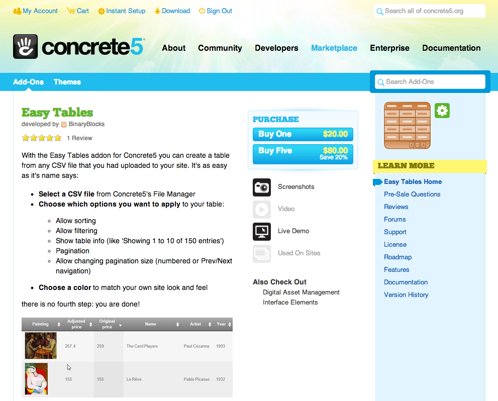 管理画面から購入する方法の他に、concrete5.org から購入することもできます。マーケットプレイスページでテーマとアドオンを検索することができます。