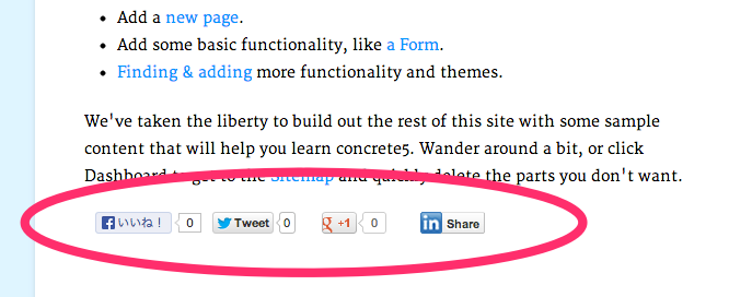 concrete5のアドオン、Social Share Lite(ソーシャルシェア・ライト)パッケージをリリースしました。このパッケージにはブロックが1つ含まれており、ページ内にブロックを追加するだけでカンタンに「いいね」ボタンや「ツイート」ボタンなどのSNSでシェアするボタンを追加することができます。特にそれ以上の説明は要らないくらいかんたんです!