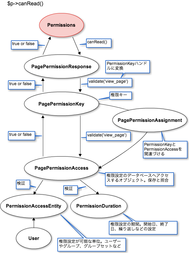 権限キーの検証は、PermissionKey クラスの子クラスで行なわれ、ページの場合は PagePermissionKey クラスになります。ただし、権限キーのオブジェクト自体はデータベースとやりとりせず、データベースへのアクセスを担当するのは PermissonAccess クラスが担当します。ページの場合は PagePermissionAccess クラスです。