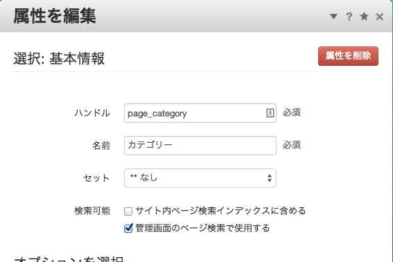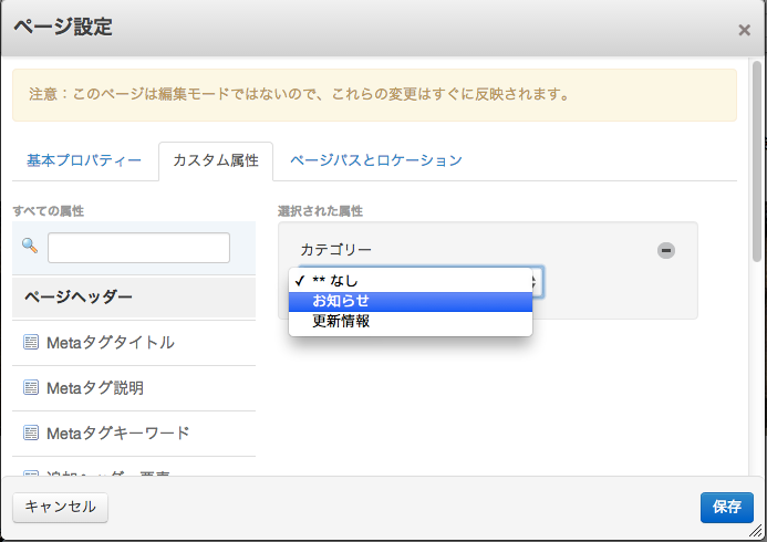 管理画面から追加した属性は、各ページの設定ウィンドウのカスタム属性タブから選ばせることができます。