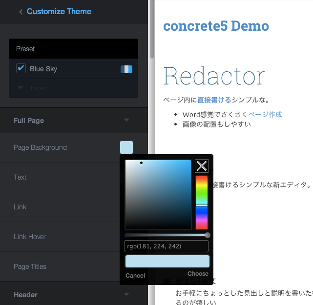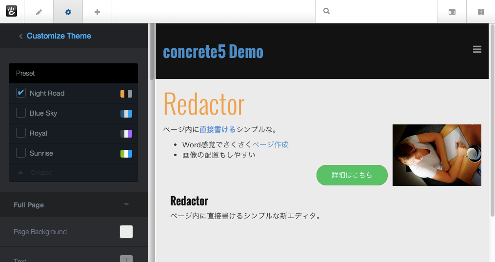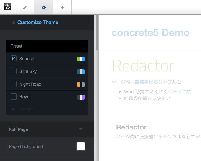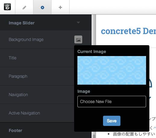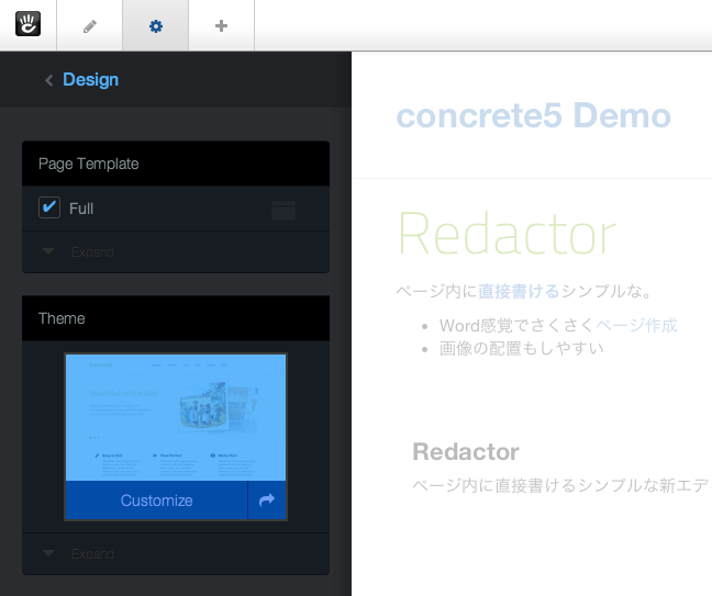 前回のプレビュー記事では主にページの編集についてお伝えしましたが、今回はデザイナーさんに注目していただきたい、テーマのデザインカスタマイズ機能についてお伝えしたいと思います。デザインカスタマイズ機能とは、concrete5にログインした編集者がサイトのデザインをカスタマイズできる機能のことです。