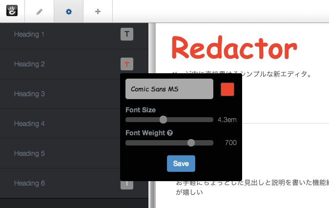 フォントはフォントファミリー、色、フォントサイズ、フォントウェイトを個別に調整できます。図はh2のフォントを調整しているところ。これで、海外製のテーマを購入してフォントが大きいなぁと思ってもカンタンに日本語サイト用に調整できますね!フォントファミリーのプリセットをカスタマイズできるかどうかは、調査中です。