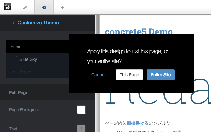 テーマカスタマイズの結果は、このページだけに適用するのか、それともサイト全体に適用するのかを選択することができます。このことで、テーマは1つで、サイト内の一部分だけのためのプリセットを用意して切り替える、という用途が考えられますね。