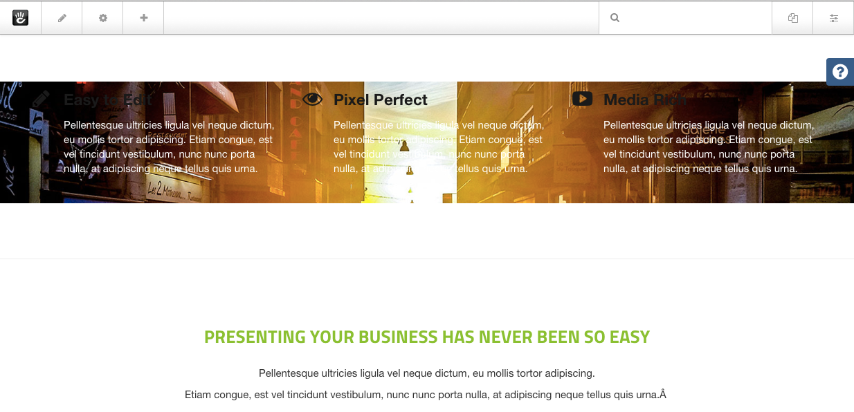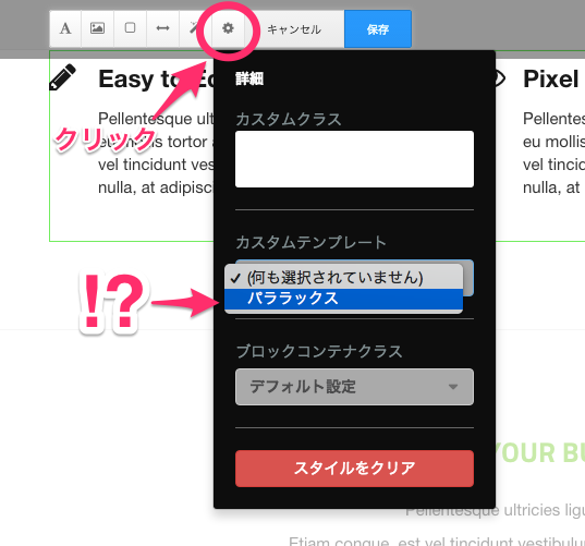 で、表示されるメニューのギアボタンをクリックすると、なにやら「パララックス」というテンプレートがある!